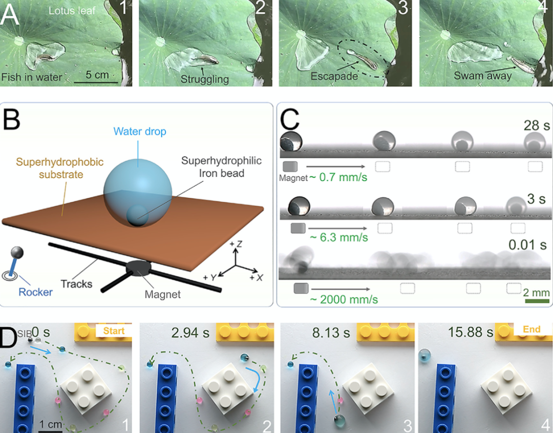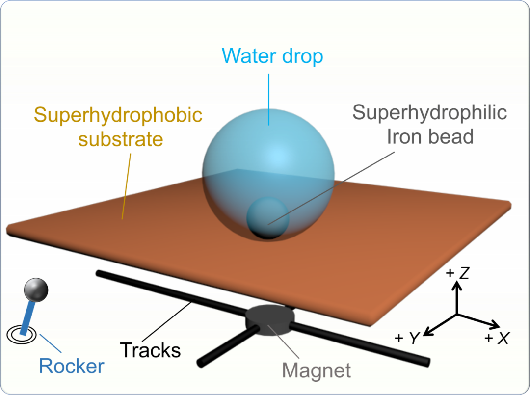 如今,来自香港城市大学和中国科学院的科研人员联合设计了一种新装置,他们使用一个具有极亲水表面的小铁珠,发明出了仿生磁驱动液体操作微机器人 Hydrobot,它可以在任意路径上驱动液滴移动,速度最高可达 2 米/秒(2000 体长/秒),随着小铁珠表面积的增加,Hydrobot 可以操纵更多的水。