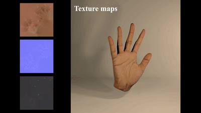 除了 MRI 数据,该研究还用光场设备采集高质量手部 diffuse、normal 和 specular 贴图。通过贴图插值,实现了对皮肤颜色和纹理的建模。