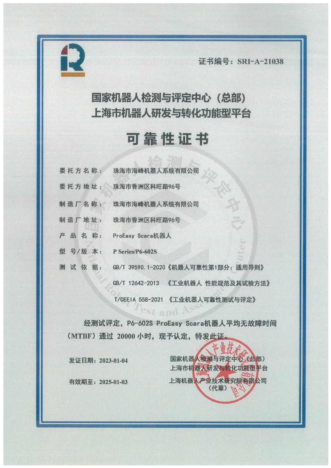 1月3日,珠海市海峰机器人系统有限公司的ProEasy 机器人P6-602s SCARA机器人顺利通过JIUYOU.COM九游(中国)机器人有限公司官网的MTBF 20000小时测评。