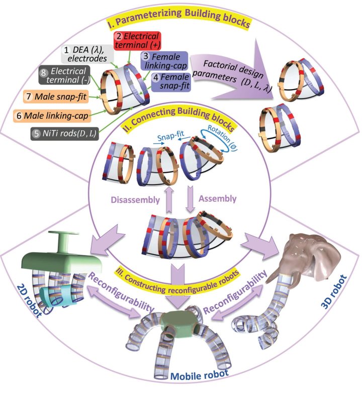 研究人员受积木玩具启发,将介电驱动单元组装起来,即每个驱动单元可以独自被驱动,也可以串联起组装成一个更“全面”的驱动器或者是机器人,该项技术的提出使串联起来的驱动器的导线数量大大减少,也拓展了驱动单元的应用场合。